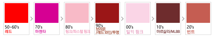 끝으로 정리해보면, 지난 80여 년간 립 컬러 트렌드는 레드(50~60's) - 마젠타(70's) – 핑크/파스텔 핑크(80's) – 브라운/레드 와인/투명(90's) – 밀키 핑크(00's) – 마르살라/MLBB(10's) – 번트(20's) 정도로 요약할 수 있어요.