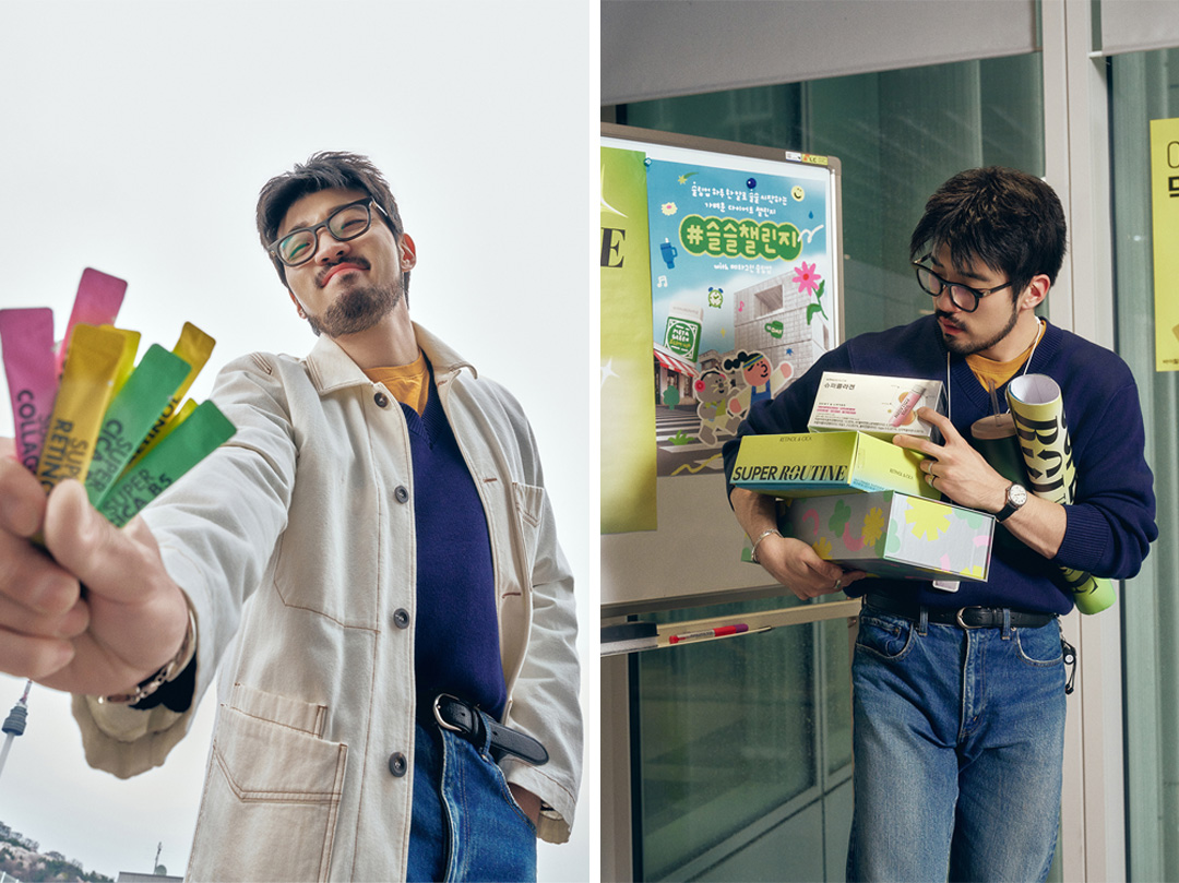 '슈퍼레티놀' '슈퍼시카 B5' '슈퍼콜라겐 케라핏' 이른바 '슈퍼 삼총사' 3종을 하나의 시딩 키트에 담아야 하는 상황이 있었습니다. 제 책상 위 틴케이스 안에 컬러풀한 이 제품들이 뒤섞여 들어가 있었는데, 어느 날 그 장면이 유독 눈에 들어왔어요. 마치 즉흥적으로 배치된 현대미술 작품처럼요. 여기서 아이디어를 얻어, 투명한 텀블러 안에 제품 3종을 자유롭게 담아보자는 제안을 했고, 실제로 구현되었습니다. 정돈 대신 '흐트러짐의 미감'을 선택한 셈이죠.
