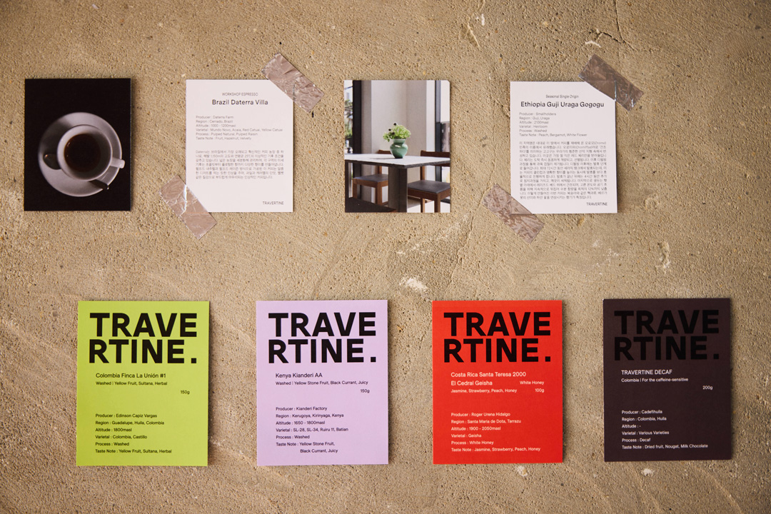 이승목 커피는 결국 그 본질이 과일이죠. 보여지는 것과 다르게 안을 파고들면 전혀 다른 물성의 것이 나옵니다. 그런 고유한 물성에 대해 주목하면서 석회암의 일종인 트래버틴(Travertine)을 떠올렸어요. 그 돌의 단면을 보면 오랜 시간 층층이 퇴적되어 만들어진 레이어가 무척 아름답잖아요. 아마도 그 레이어는 오래 전 어떤 다른 물성의 것이었을테고요. 그런 것에서 영감을 받아서 짓게 된 이름입니다. 맛있는 한 잔이 되기까지의 정성스런 과정과 또 그 너머의 본질까지 느껴지는 커피를 만들고 싶다는 마음이었죠. 이곳 1호점 매장의 주요 인테리어 마감재도 트래버틴을 사용해서 공간과 브랜드의 의미를 하나로 잇고 있습니다.