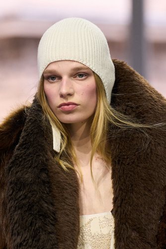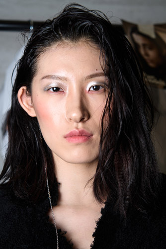 이번 컬렉션에서는 90년대와 2000년대 초반에서 영감을 받은 스머지드 아이라인과 번진 듯한 쉐도우 표현이 다시 등장하며 ‘그런지 글램’ 트렌드와 연결되고 있는데, 이는 기존의 완벽하게 블렌딩된 스모키보다 의도적으로 흐트러진 표현과 불완전한 터치감을 살리는 것이 핵심이다. 컬러는 브라운과 블랙을 중심으로 한 딥 톤이 주를 이루며, 눈동자 위쪽으로 그라데이션의 비중을 높여 눈매를 보다 날렵하고 구조적으로 강조했다. 아이 메이크업에는 강한 포인트를 둔 반면에, 피부는 모공까지 정돈된 세미 매트 혹은 은은한 새틴 텍스처로 표현해 대비를 극대화했다. 여기에 채도가 낮은 립 컬러를 매치함으로써 전체적으로 균형 잡힌 글램 룩을 완성한다.