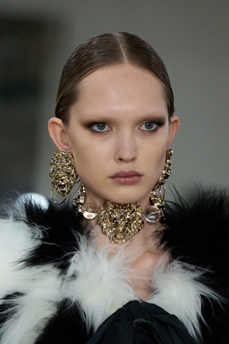 스모키 아이 메이크업이 오랜만에 돌아왔다. 특히 Blumarine 컬렉션에서는 눈썹을 제거하는 과감한 연출을 통해 스모키 아이를 극대화하고, 얼굴의 뼈 구조를 선명하게 드러내며 강렬하면서도 관능적인 룩을 완성했다.