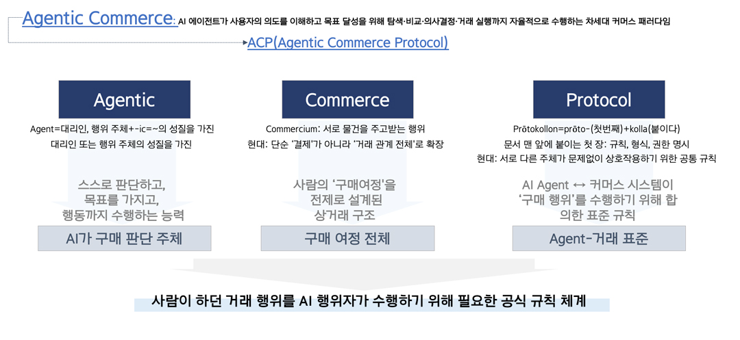 Agentic Commerce란 AI 에이전트가 사용자의 의도를 이해하고 목표 달성을 위해 탐색-> 비교 -> 의사결정 -> 거래 실행까지 자율적으로 수행하는 차세대 커머스 패러다임을 의미합니다. 이제 AI는 단순히 ‘추천을 해주는 도구’가 아니라