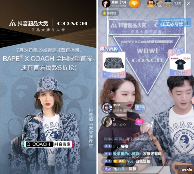 코치는 중국 배우 치웨이와 손을 잡고, 2021년 7월에 자사의 BAPE 캡슐 컬렉션을 홍보하고 판매하는 등 유명인을 활용한 라이브 쇼핑의 힘을 활용했다. 치웨이는 해당 브랜드와 상품에 대한 자세한 내용을 나누며, 실시간으로 팬들의 질문에 대한 답을 제공했다. 코치는 6시간 동안 진행된 이 세션 동안 해당 컬렉션을 완판했다고 보고했다.