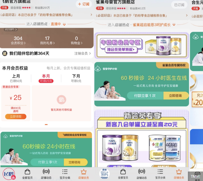 중국 국내 브랜드 페이허와 해외 브랜드 네슬레와 거버 등, 티몰에서 상품을 판매하는 여러 분유 브랜드들도 유료 회원을 위한 온라인 교육 세션을 진행했다. 1,000여 명의 소아과 전문의를 초청해 아기 분유 및 음식물 알레르기에 대한 과학적인 조언을 제공했고, 어머니들이 자녀의 영양에 대한 맞춤화된 조언을 구할 수 있는 실시간 상담 서비스와 전문가 동영상 시리즈를 선보였다.
