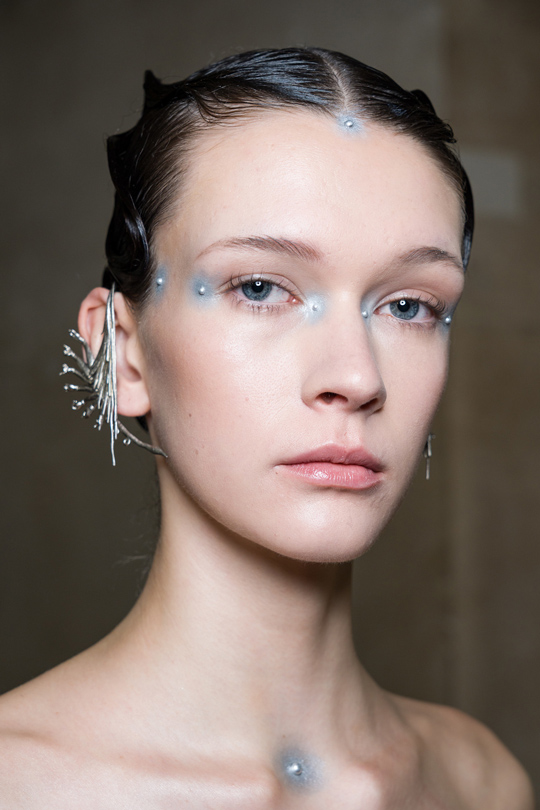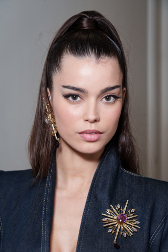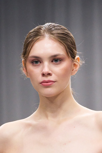 This soft draping technique, which connects the cheeks and the eye area in a continuous wash of color, played beautifully against the architectural tailoring at Julien Fournié, where bold silhouettes dominated. The contrast made the makeup feel all the more fluid and supple, the overall impression one of strength and delicacy held in the same breath. At Maison Novague, the quality of light on the skin reads less as shine and more as a kind of refined luminosity.