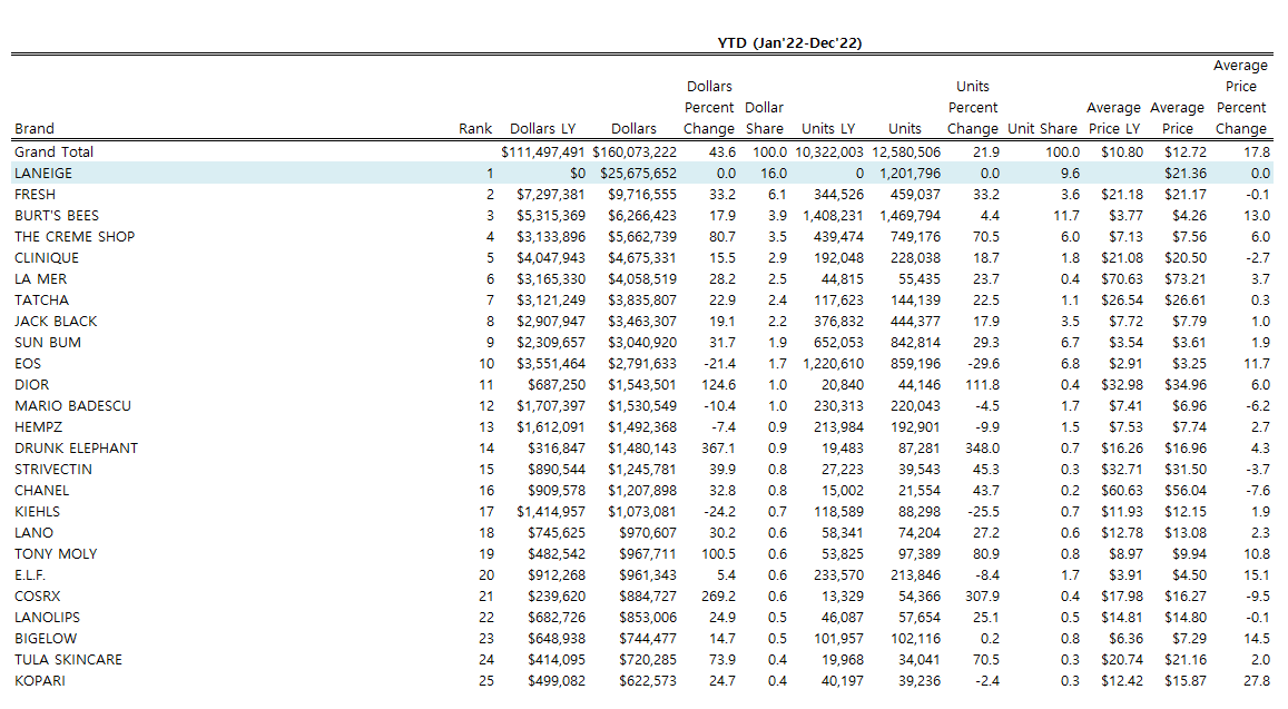 NPD '22년 4분기 미국 뷰티 시장 Raw Data