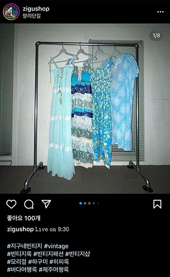 저는 인스타그램 빈티지 숍 계정에서 하는 라이브 방송을 즐겨 봐요. 그날 판매할 의류를 행거에 쭉 걸어 놓고 한 벌씩 보여주면서 방송을 진행하는데요. 옷을 구매하고 싶은 사람은 댓글로 먼저 의사를 밝혀요. 그리고 나중에 입금을 하는 방식이에요. 라이브 커머스처럼 실시간으로 소통하며 물건을 사고파는 방식인 거죠. 댓글로 옷의 소재나 재질에 대해 물어 보고, 본인 사이즈를 얘기하면서 옷이 잘 맞을 것 같은지 확인 요청하는 사람들도 많아요. 빈티지 제품이라 희소성이 있어서 그런지 시청하는 사람들도 꽤 있는 편이고요. 기존의 라이브 커머스 플랫폼에서 하는 방송들은 너무 각 잡고 영업한다는 느낌이 들어서 잘 안 보게 되는데, 인스타그램 마켓 라이브 방송은 편하게 소통하는 느낌이라 자주 보게 돼요. 한소연(27세, 직장인) |