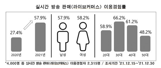 흔히 라이브 커머스하면 ‘실시간 소통’이 가능하고 ‘모바일’을 기반으로 쇼핑이 가능하기 때문에 전 연령대 중 Z세대 이용자가 가장 많을 거라 생각하실 수 있는데요. 올해발표된 서울시의 ‘라이브 커머스 이용 실태 조사’에 의하면 20~50대 중 20대의 라이브 커머스이용 경험률(58.9%)은 3위에 그쳤습니다. 가장 이용 경험률이 높은 세대는 30대(66.2%)와 40대(61.2%)였어요. 3040이 20대보다 홈쇼핑 문화에 익숙하기 때문에이런 결과가 나온 것으로 풀이됩니다. 대다수의 라이브 커머스 방송이 홈쇼핑과 비슷한 구성으로 진행되는데, 홈쇼핑 문화에 익숙한 3040이 그렇지 않은 20대보다 진입장벽을 낮게 느끼는 것이죠.
