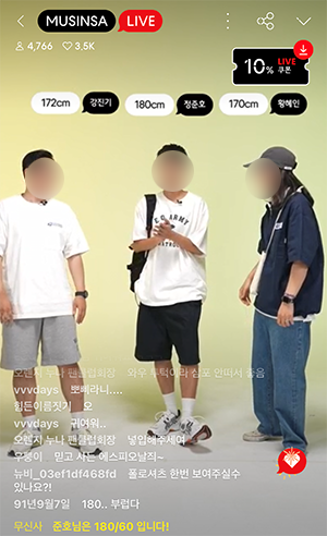 출연자들의 사이즈를상단에 띄운 무신사 라이브